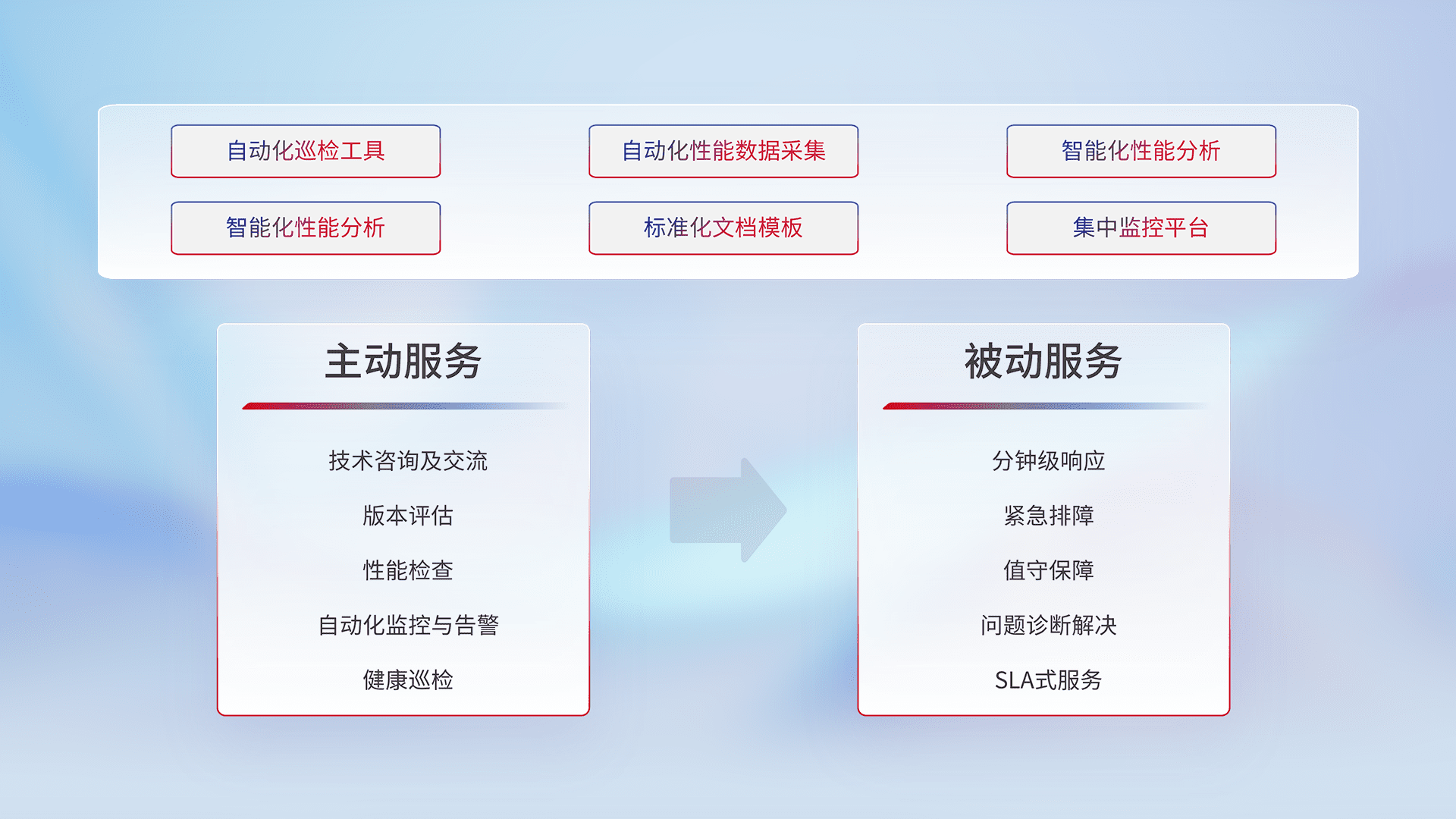 智能化工具和标准化文档,,保障服务质量,,,提供主动服务(包含技术咨询、、、版本评估、、性能检查、、、、自动化监控与告警、、、健康巡检)和被动服务包含(分钟级响应、、紧急排障、、、、值守保障、、、、问题诊断解决、、、、SLA服务)。。。